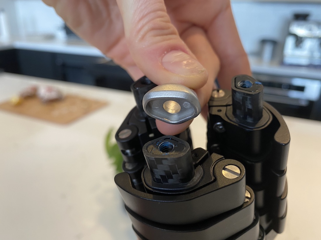 3. Na místo patek položte správně orientované hroty a přišroubujte je stejným šestihranným klíčem. Utáhněte (není třeba velkou silou, jen pevně utáhnout tak, aby byl šroub zcela zašroubován a hrot pevně připevněn a neklepal se) a je to!